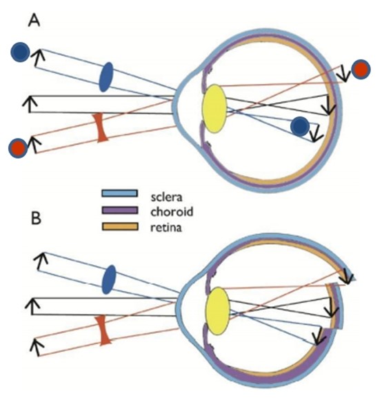如上圖A 所示,圖A 上方藍色小球的經凸透鏡會成像在視網膜之前,紅色小球經凹透鏡會成像在視網膜之後,中間黑色部分光線在正常成像在視網膜之上。經實驗研究證實,眼軸會向著光學離焦的方向生長,簡單的說,圖A 右上方藍色小球成像於視網膜前,會讓視網膜趨向成像位置方向生長(比如植物的向光性,植物會向有陽光的地方生長,視網膜則會趨向成像的位置生長),因為藍色小球成像於視網膜前, 所以會進一步抑制眼軸成長,最終變成圖B 示意圖,對照於參考的黑色路徑上的視網膜,藍色路徑上的視網膜要內縮才能追上成像(藍色小球)的位置,可以抑制眼軸成長。